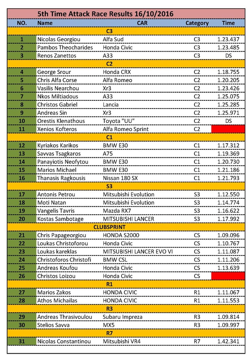 Στις 16/10/2016 πραγματοποιήθηκε με επιτυχία ο 5ος αγώνας Time Attack Cyprus για το 2016. Με έναν αγώνα να να απομένει για την ολοκλήρωση του πρωταθλήματος, το πρωτάθλημα έχει πάρει φωτιά, ειδίκα στην κατηγορία Clubsprint όπου οι 3 πρώτες θέσεις έχουν διαφορά μόλις 3 βαθμούς.
